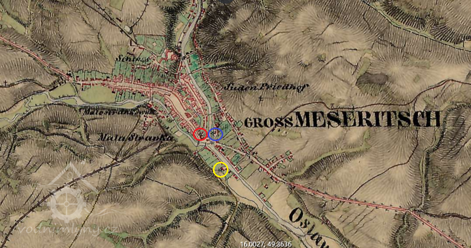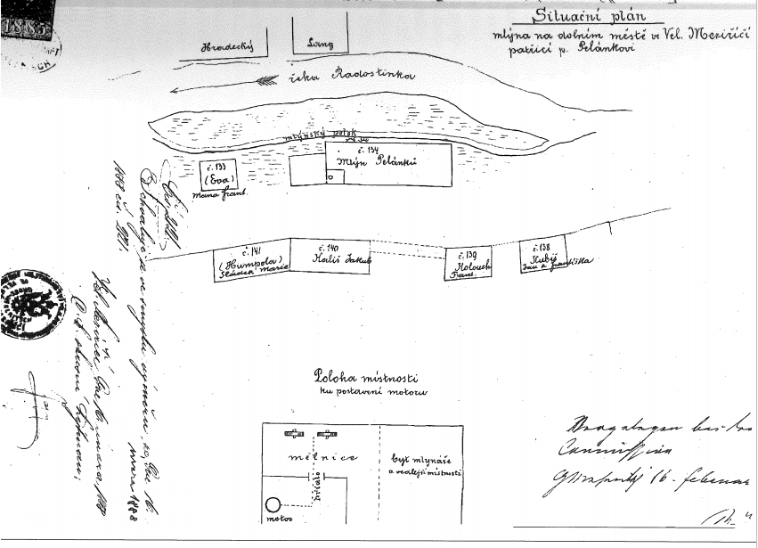 Popis1930: 1 kolo na střední vodu, hltnost 0,5 m3/s, spád 2,35 m, výkon 6,2 HP, prům. 5 m, šíře 1 m
