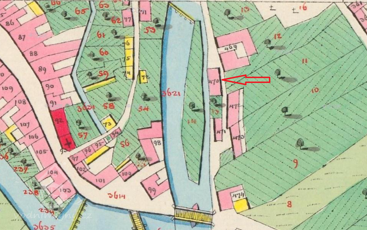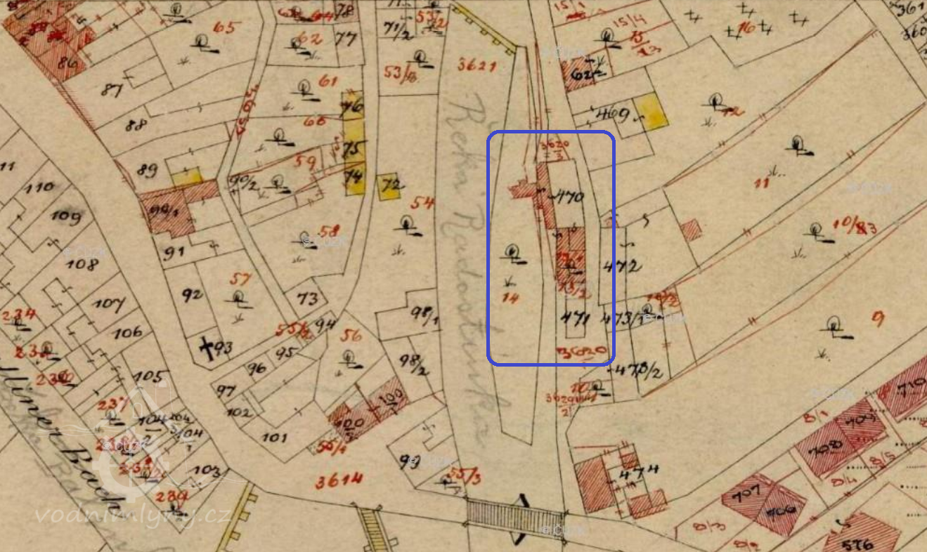 již nefunkční vodní kolo se zde nacházelo až do dubna 1960, před zatrubněním náhonu bylo odstraněno