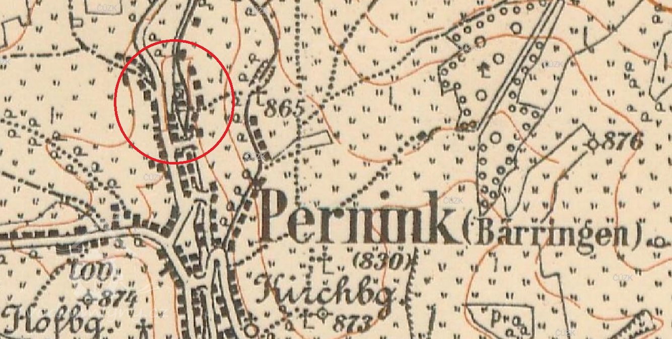 Po r. 1788 dostal perninský pekař Johann Hermann povolení od ostrovské vrchnosti postavit obilný mlýn v horní části Perninku. Tento horní mlýn stával u dnešního č. p. 39 mezi Blatenskou a Bludenskou ulicí a vodu bral rovněž z náhonu svedeného z Bystřice. V těchto místech již v 16. století stály hutě, koncem 19. století zde pak vznikla první vodní elektrárna.
