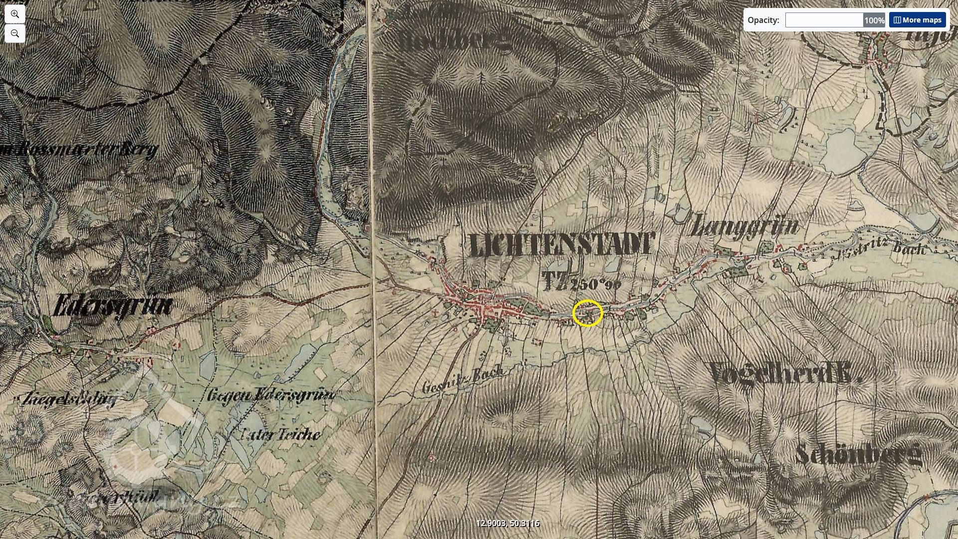Mlýn se nacházel na pravém břehu za silnicí ,naproti mostu do zemědělského areálu. V roce 1878 majitel mlýna Ignác Hammer zapisuje vlastnictví na své tři děti Franzisku, Magdalenu a Marii Hammerovi. V roce 1887 sestry Franziska provdaná Lillová a Magdalena provdaná Schmidtová prodávají podíly sestře Marii teď Műllerové a Jakobu Műllerovi. V r. 1918 kupuje mlýn Jakob Műller a v roce 1920 převádí polovinu na nezletilou dceru Annu, v roce 1933 i druhou polovinu a v roce 1942 je už