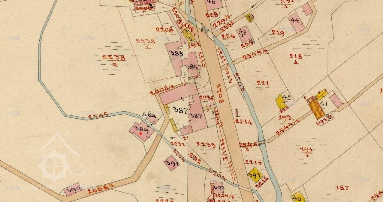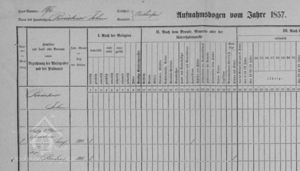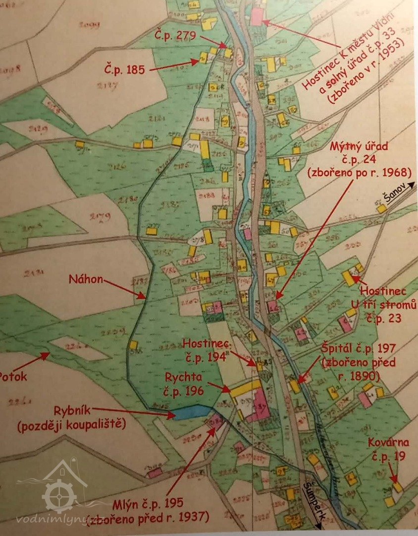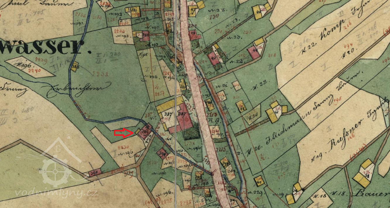 V roce 1857 a 1869 mlýn vlastní Johann Brükner, nar. 1834, který bydlí v sousedním domě čp. 196, mlýn provozuje mlynář Jozef Rosenberger, nar. 1842, který je zde v nájmu.
