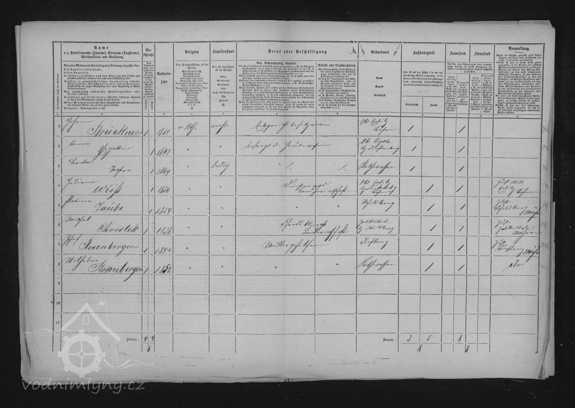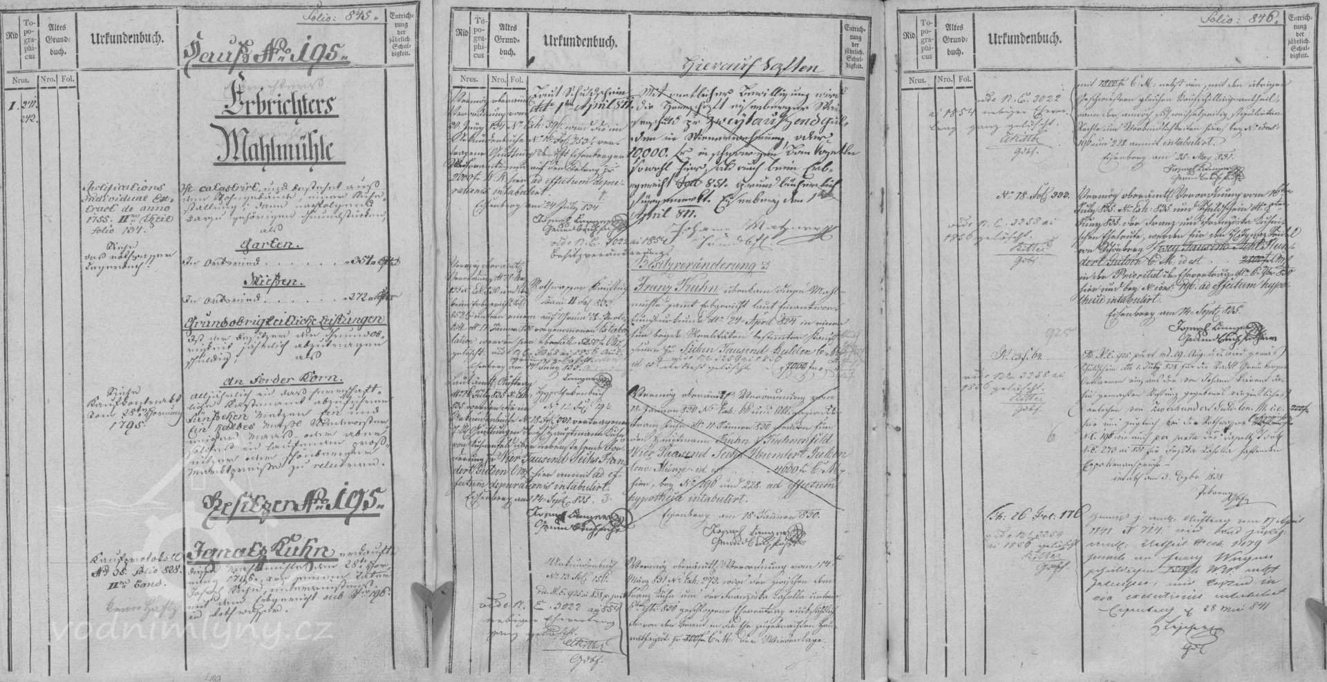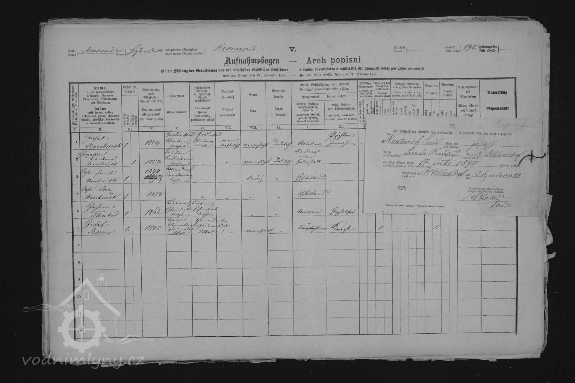 V roce 1857 a 1869 mlýn vlastní Johann Brükner, nar. 1834, který bydlí v sousedním domě čp. 196, mlýn provozuje mlynář Jozef Rosenberger, nar. 1842, který je zde v nájmu.