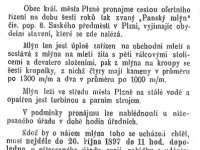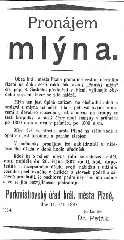 V letech 1400 - 1420 byly v Plzni čtyři mlýny, největší tzv.Veliký mlýn o deseti složeních před Pražskou bránou, později zvaný Panský.(HŠ)