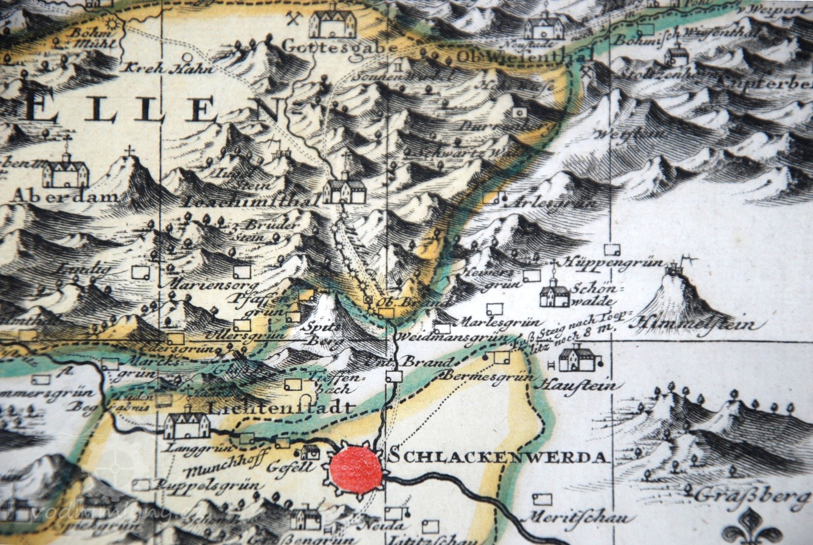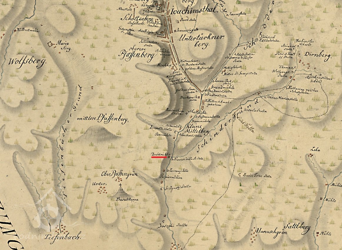 Na mapě Chebského kraje z roku 1715 je mlýn ještě označen jako obilný mlýn. Na mapě z roku 1742 Thermas Carolinas je již mlýn označen jako drátovna s odlišným symbolem mlýnského kola. V kronice města se zhruba do roku 1720 hovoří o mlýnech. Po tomto datu již kronika výslovně hovoří o mlýnech, papírnách, drátovnách. Jinak tento mlýn společně s dalšími v oblasti zvané Mühlengrünn (později Mühlenthal) patřil společně s Horním Žďárem městu Jáchymov.