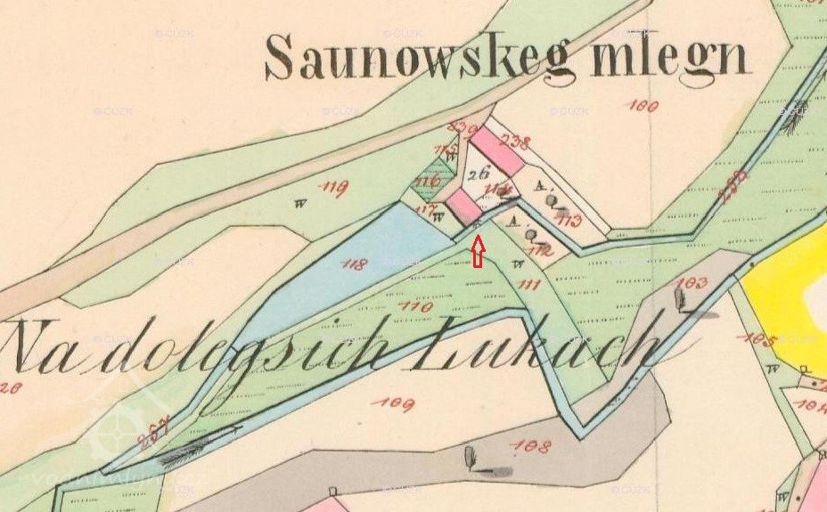 Za šesté: Odevzdávají a odstupuji prodávající celý mlejn i s grunty kupujícímu hned od 1-ho září běžného roku do úplné vlastnosti a k libovolnému vládnutí- nezanechávají si na něm žádného práva. Jestli by budoucně jakýchkoliv způsobem tyto grunty prospěchu došli: a taktéž kupující přijímá od 1-ho září běž. roku všechny břemena neb i povstati mohoucí škody, jenž by zde z prvotních smlouv neuvedené závazky, anebo jinou náhodou na stavebních a gruntech později se jevila.