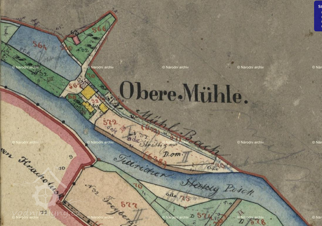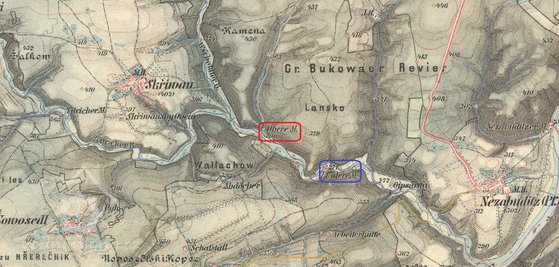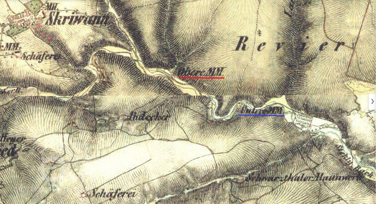 1654 revizitační komise uvádí ve Skřivani mlýny dva - mlýn na křivoklátském gruntu a Horní mlýn
