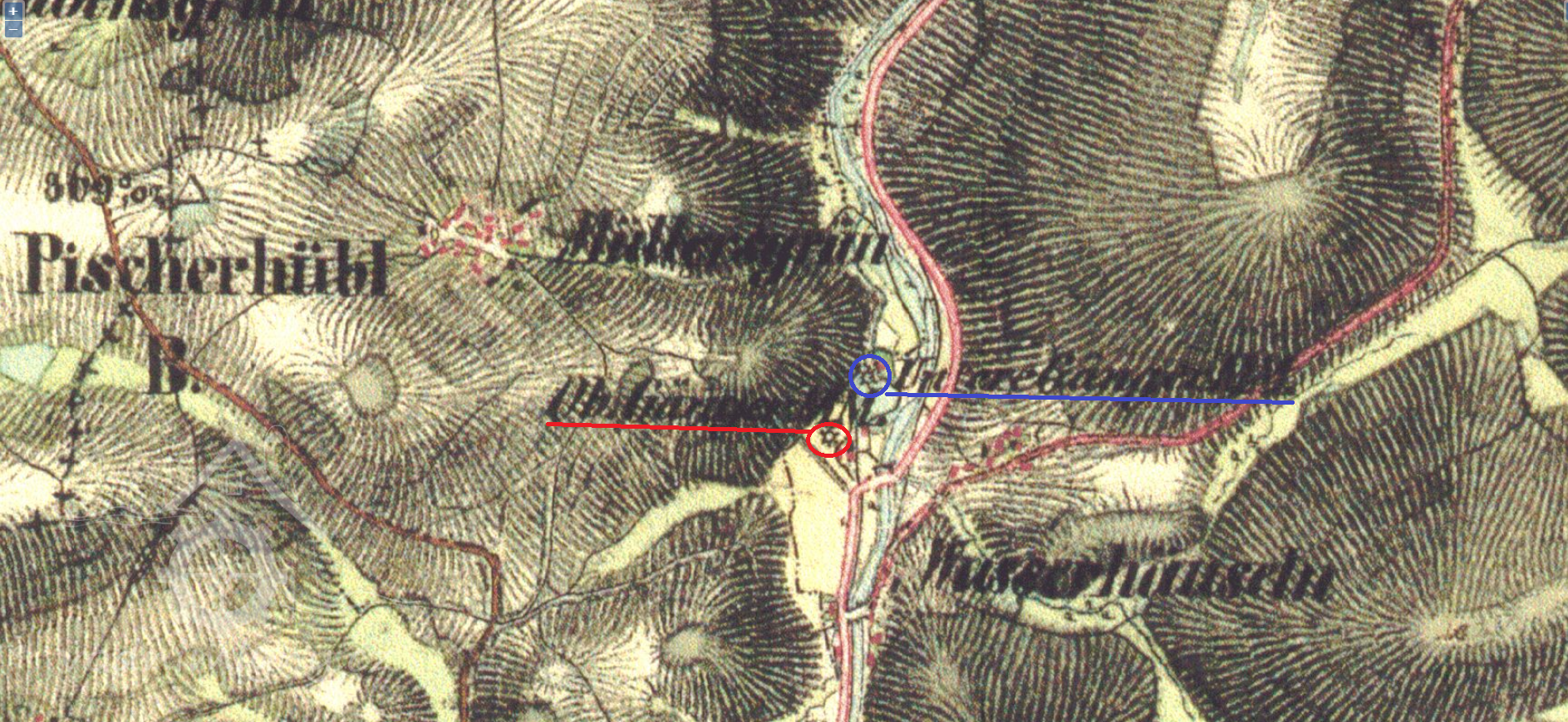 Horní (červeně) a Dolní (modře) Gängrův mlýn, III. vojenské mapování, výřez, 1877-1880, © oldmaps.geolab.cz