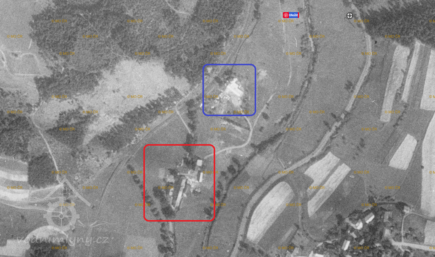 Horní (červeně) a Dolní (modře) Gängrův mlýn, letecký měřický snímek, výřez, 1961, © lms.cuzk.cz