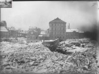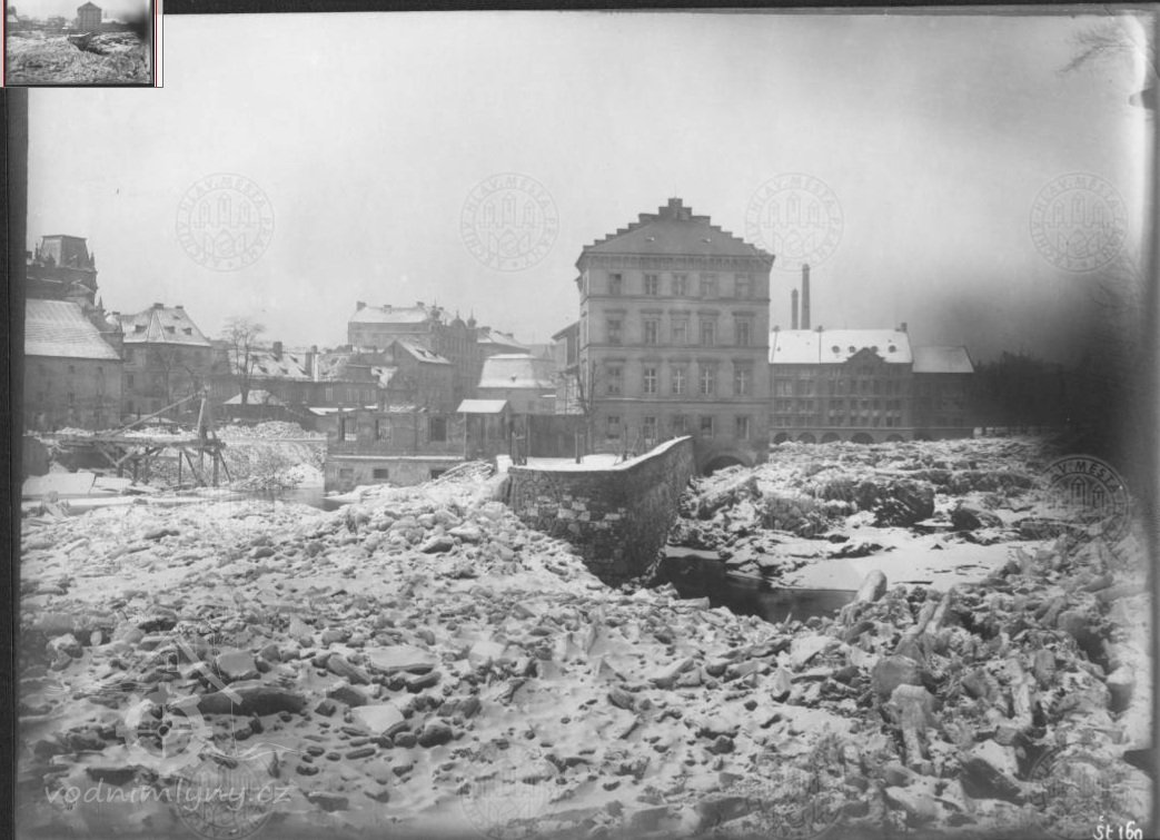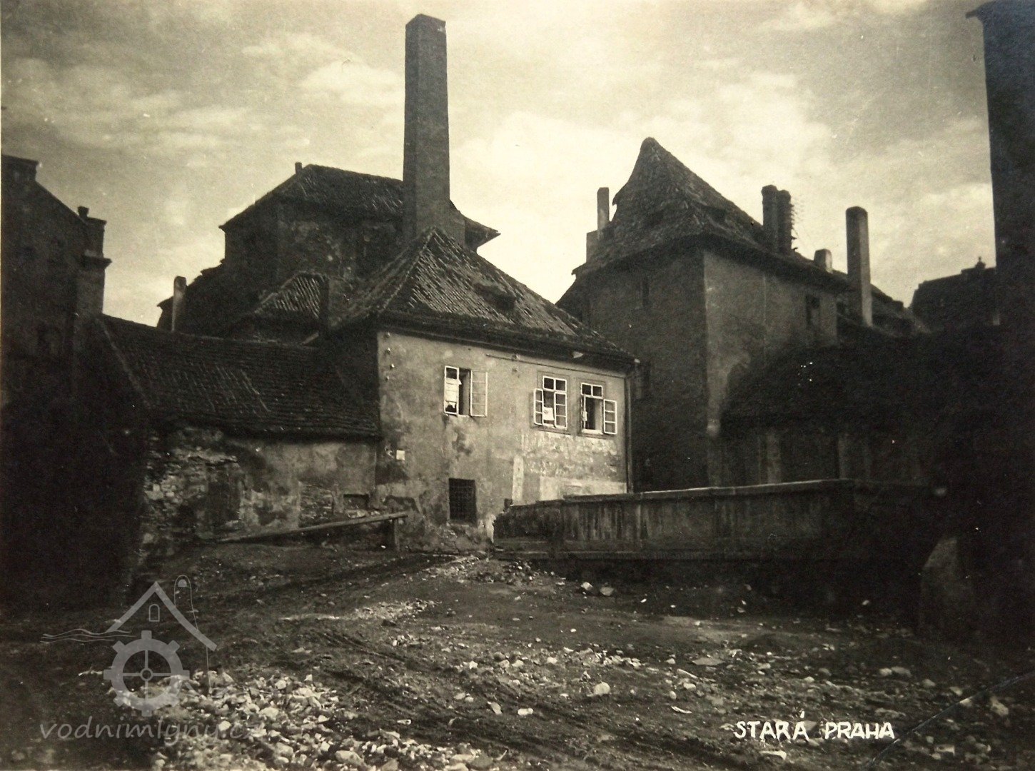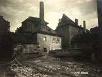 Pohled na částečně zbořené Helmovské mlýny na Novém Městě - zleva Kubešův mlýn (dům čp. 1220), zbytky mlýna čp. 1303 a mlýn čp. 1222. V pozadí Dolní Lodecké mlýny a domy v Klimentské ulici., 02 1909, © AHMP