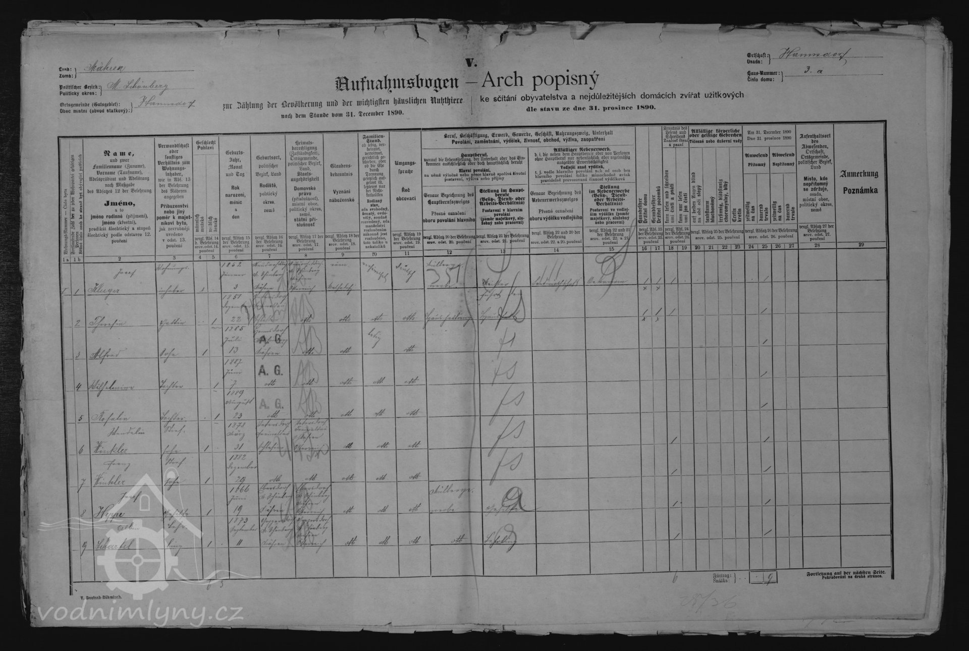 sčítací arch, 1890, © Digitální archiv Zemského archivu v Opavě