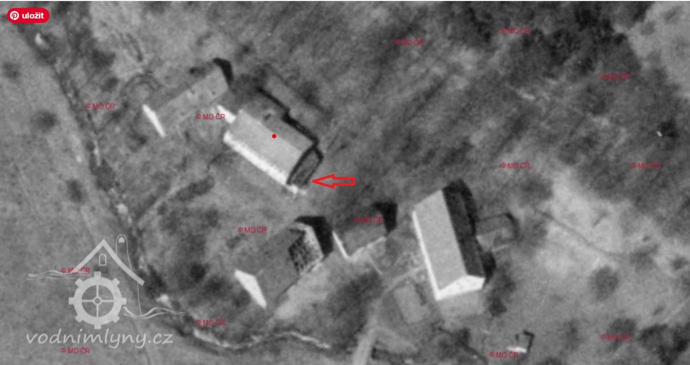 Národní archiv leteckých měřických snímků (šipkou označeno vodní kolo), 1962, © viz lms.cuzk.cz