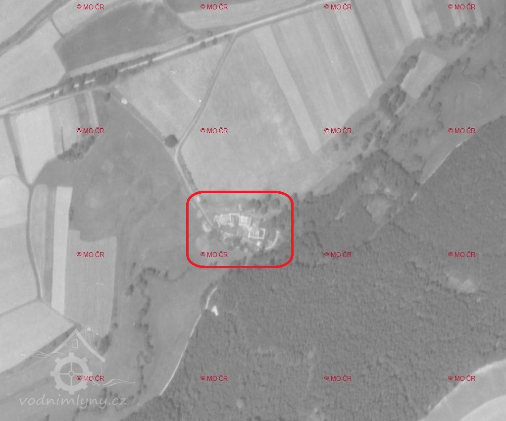 Letecký měřický snímek, výřez (vyhořelý Speckermühle na bavorské straně), 1947, © ags.cuzk/archiv