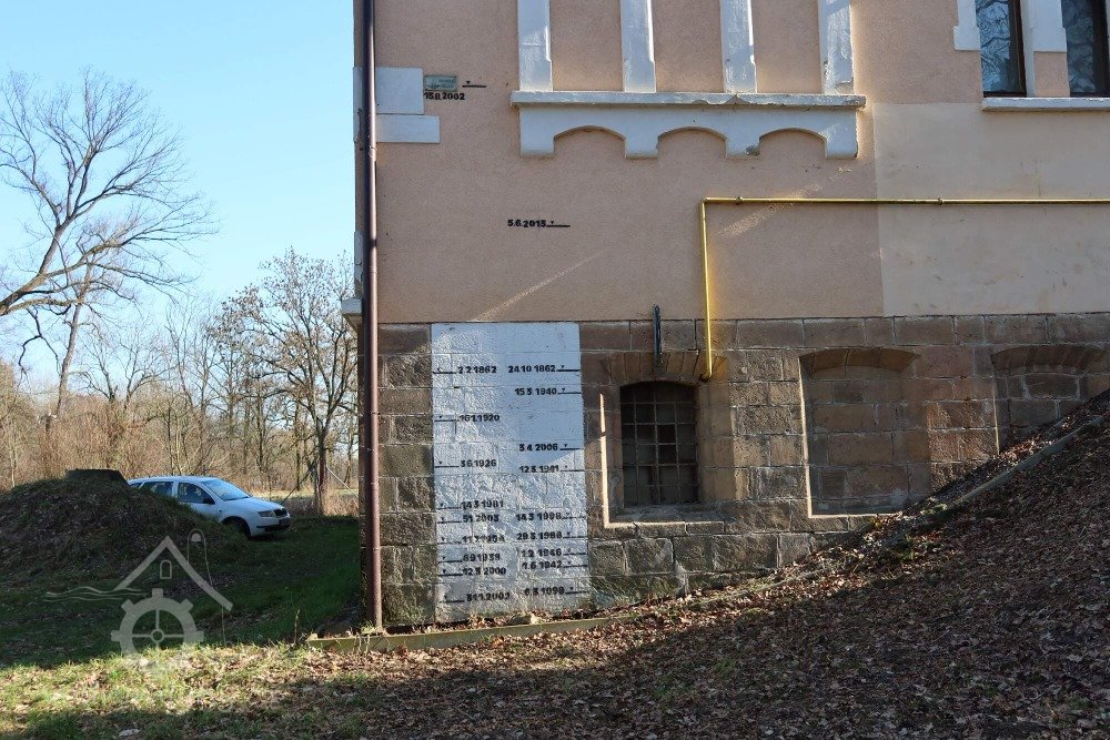 Nároží se záznamy výšky vody při povodních, 03 2026, © Petr Dražil