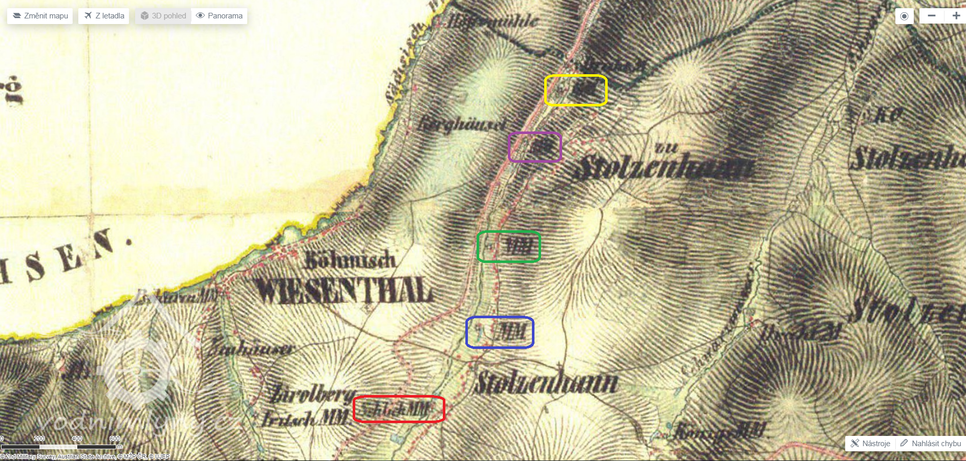 Šlikův (červeně), Schadův (modře) a Hansarlův (zeleně) mlýn v Háji a Horní (fialově) a Dolní (žlutě) mlýn v Koutu, 1836-1852, © oldmaps.geolab.cz