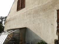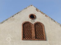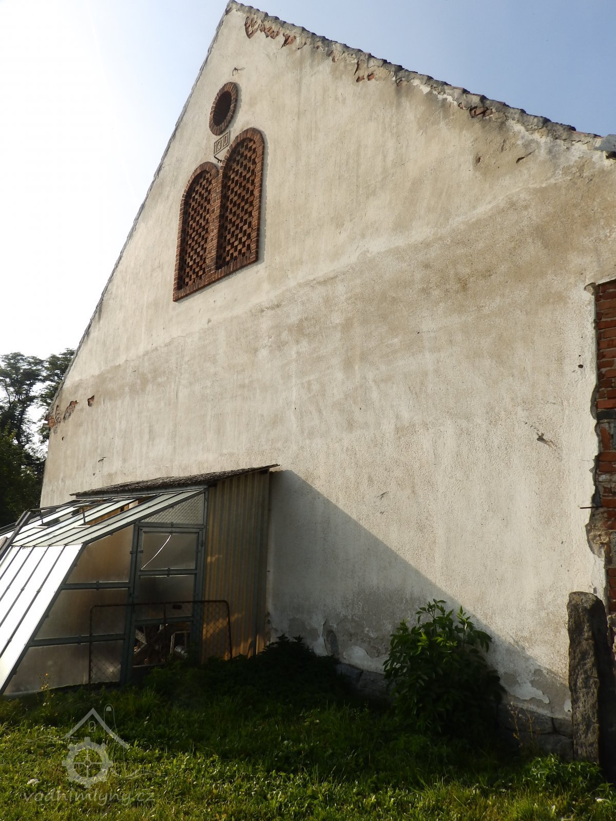 Zdobený štít stodoly, 2016, © doxa, (Prvky na obrázku: epigrafické památky (nápisy, datování aj.), plastická omítková výzdoba fasád a štítů, zdobený zděný štít)