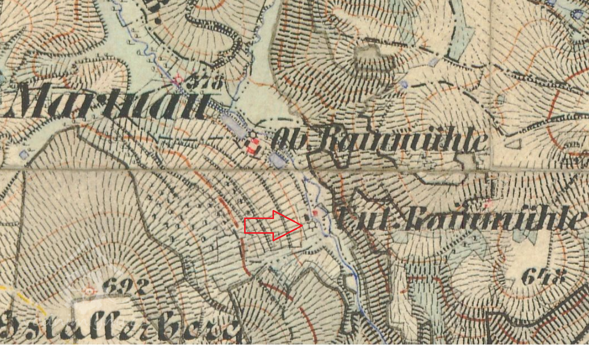 Vodní provoz postavili Schweinitzerové vlastnící starší a výše položený mlýn Obere Rainmühle kolem roku 1750 původně jako pilu. Brzy byl však využíván i jako obilný mlýn. Nějakou dobu se nazýval také Neumühle, Nový mlýn.
