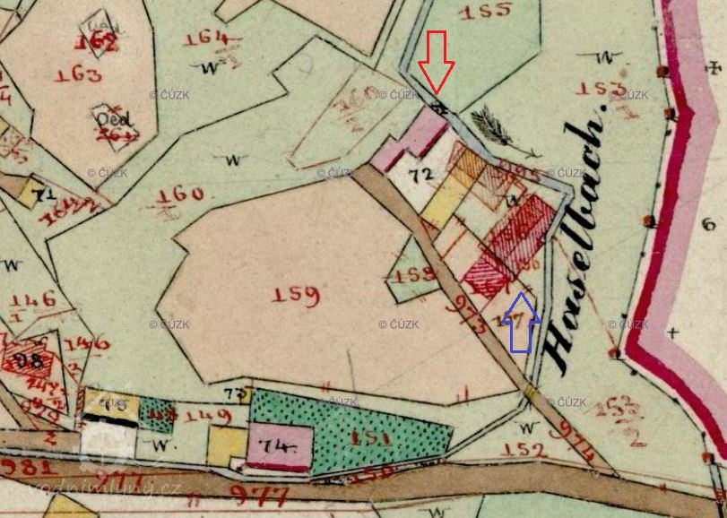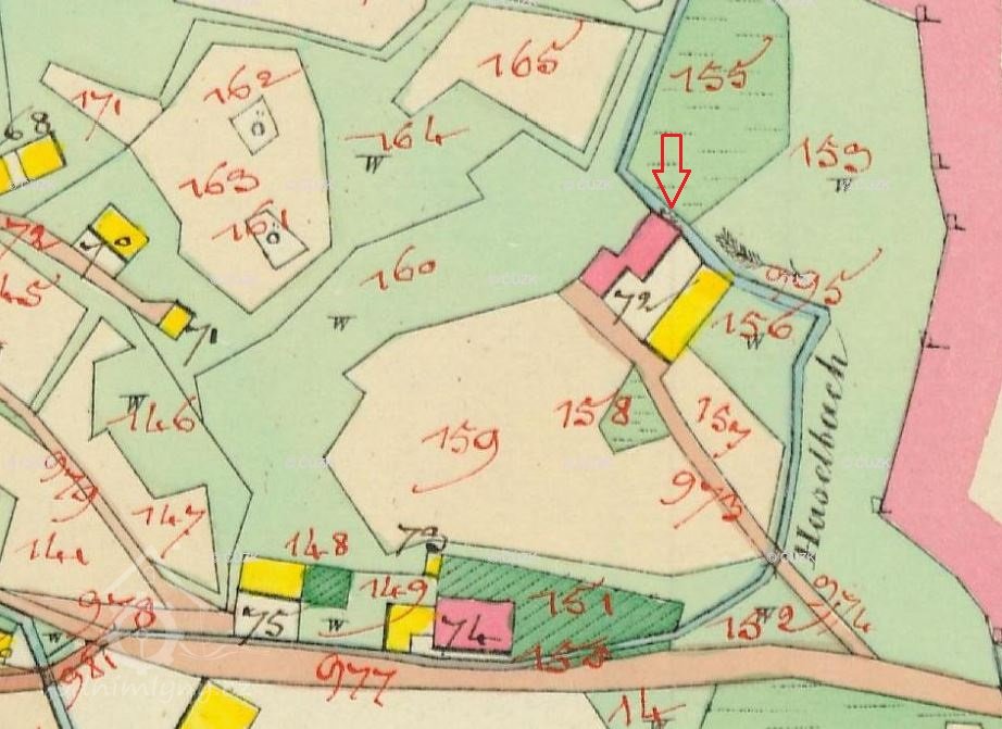 V roce 1874 je uváděn mlýn se dvěma vodními koly a pilou ve vlastnictví Adama Häupla (narozen 1819 v obci Branka) a Susanny Häupl (narozena 1827 v obci Obora - Thiergarten). Jsou zde uváděni již v soupise obyvatel při sčítání lidu z roku 1869 s dětmi Annou (1848), Franzem (1853), Ferdinandem (1855) a Theresií (1858).