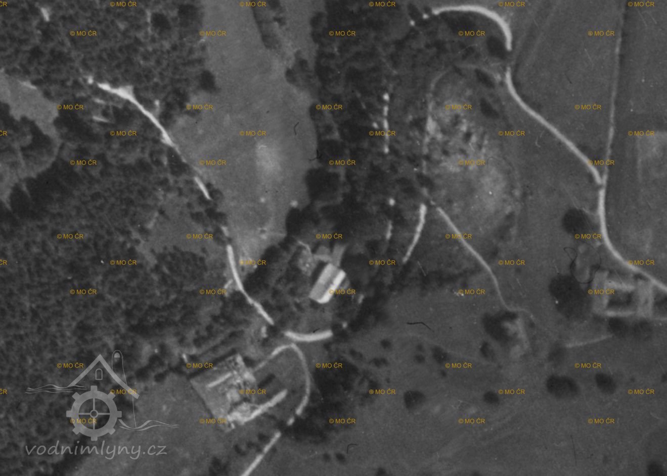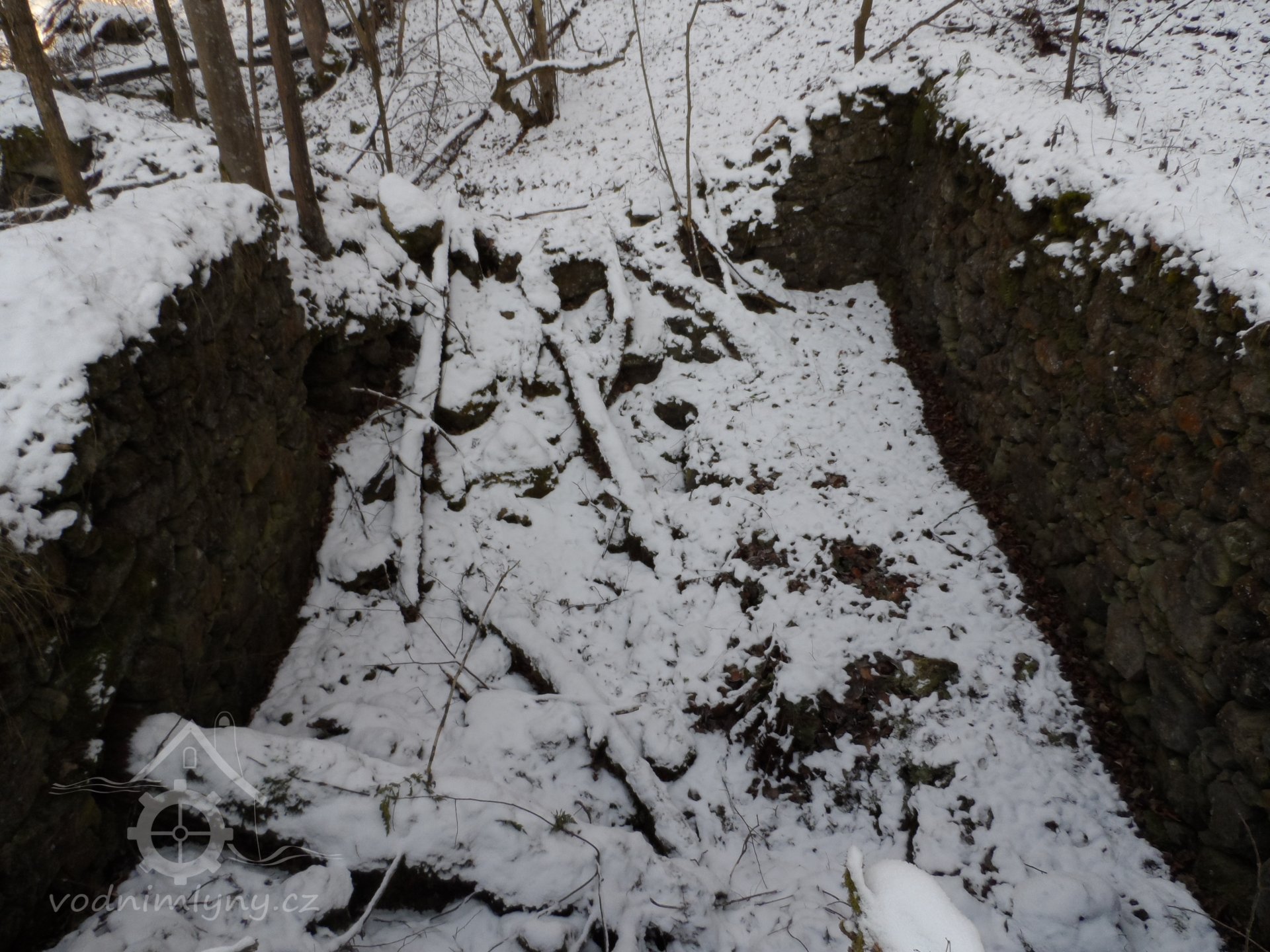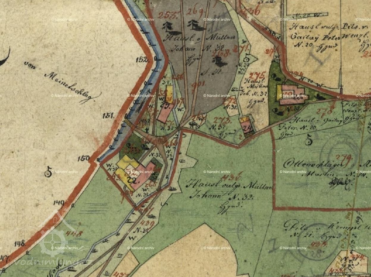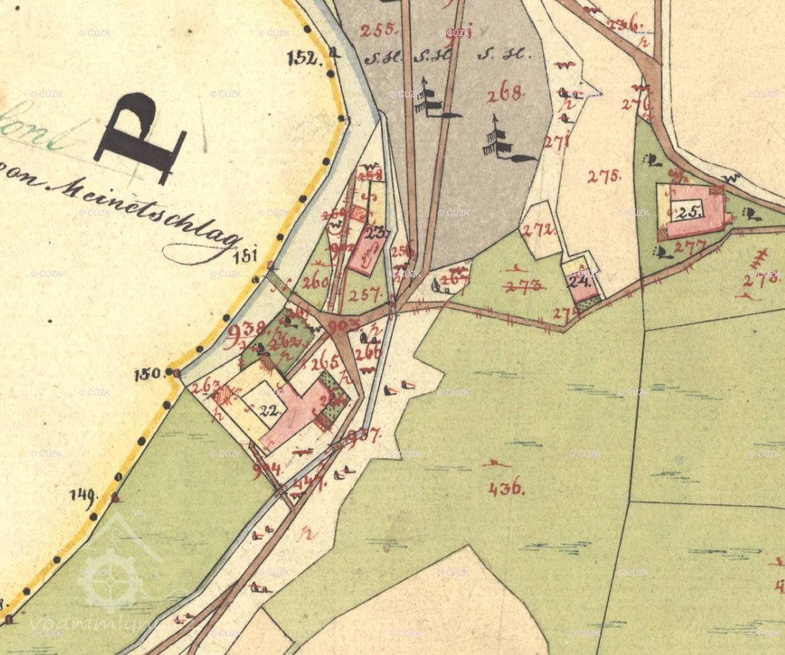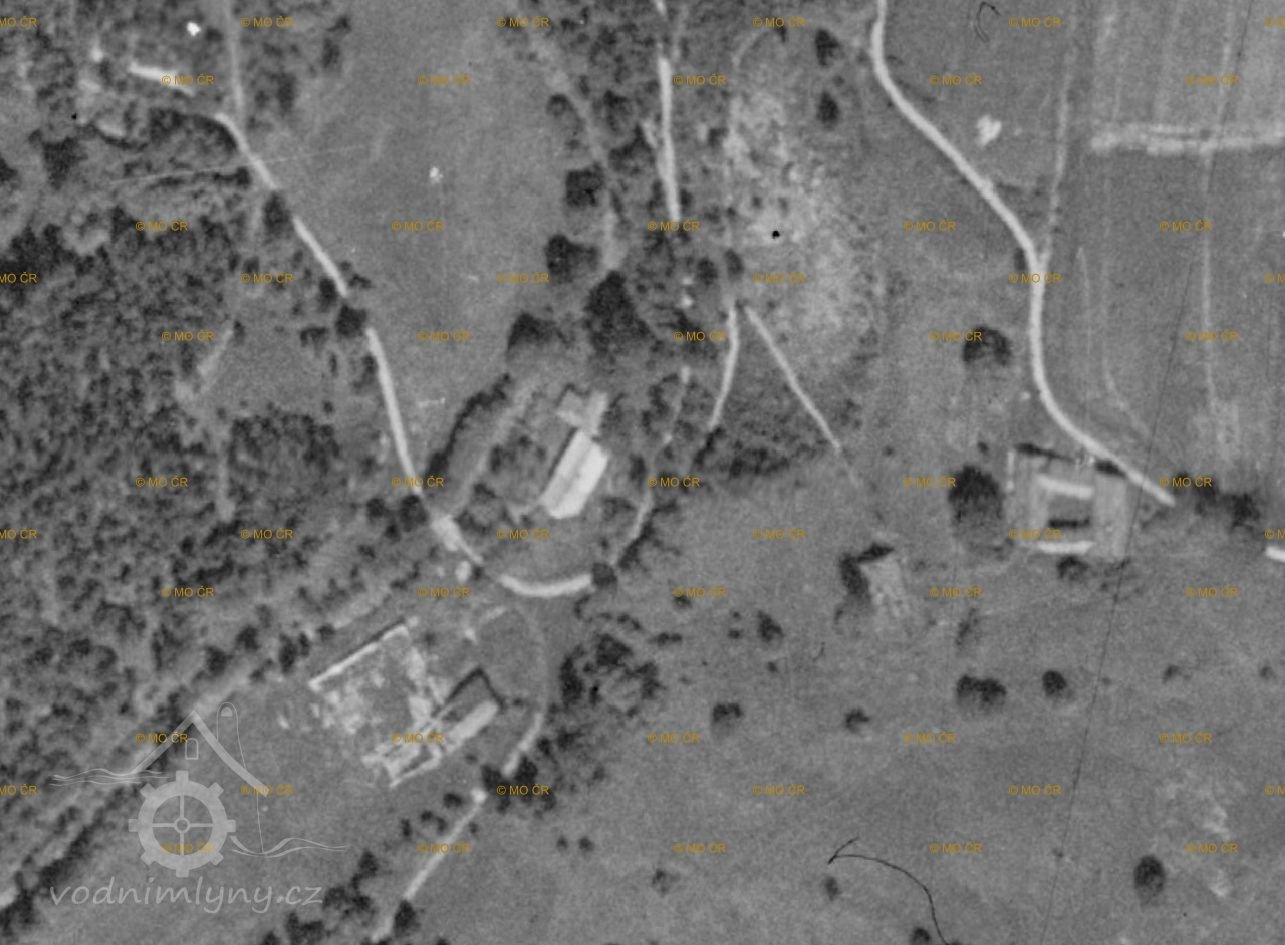 Zaniklý mlýn s pilou se třemi koly na svrchní vodu.