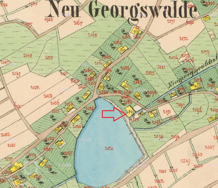 V roce 1771 dostal při číslování domů čp. 43. V té době zde hospodařil mlynář Josef Kümpfel (narozen 1729) s manželkou Marií Elisabeth (1727). V soupise poddaných pro obce Nový Jiříkov z roku 1773 je zde mlynářský pár uveden společně se 4 syny Josefem (stár 20 roků), Franzem (18), Antonem (16) a Ferdinandem (14).