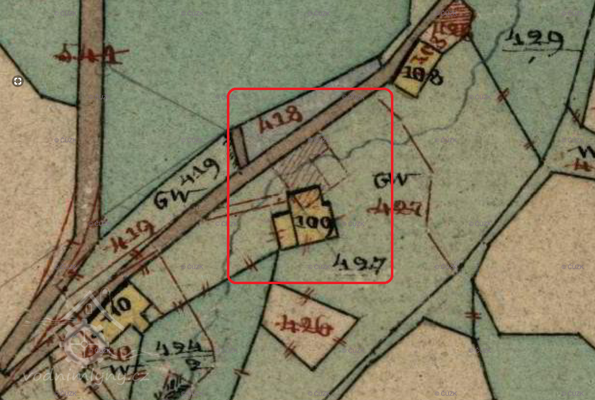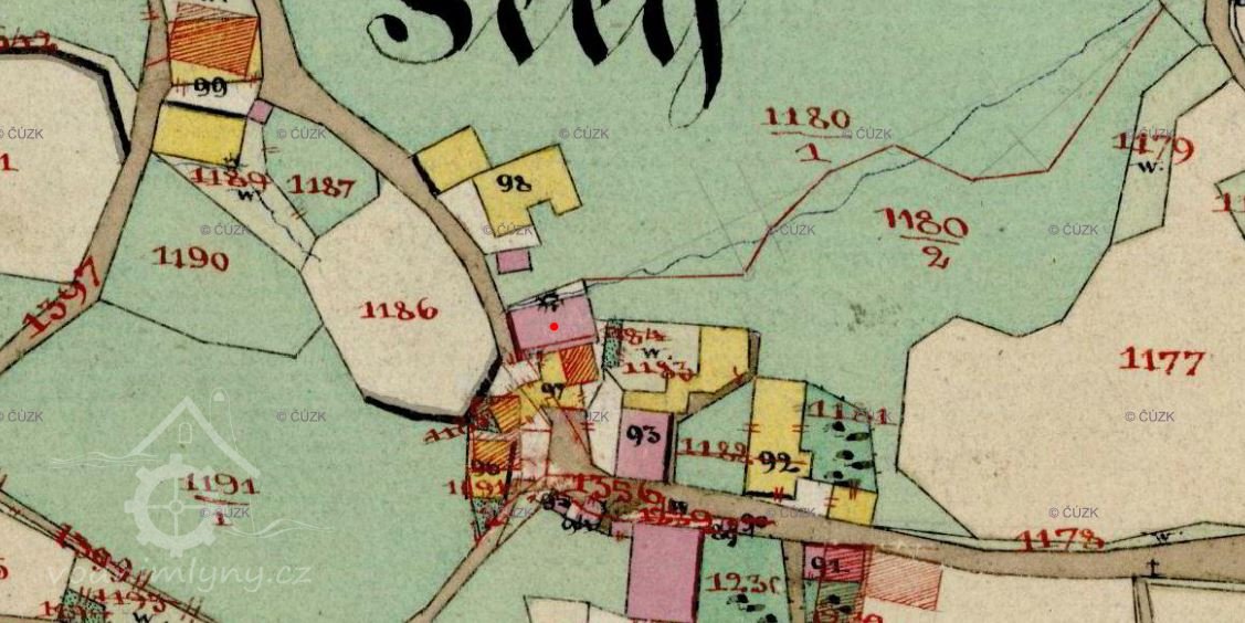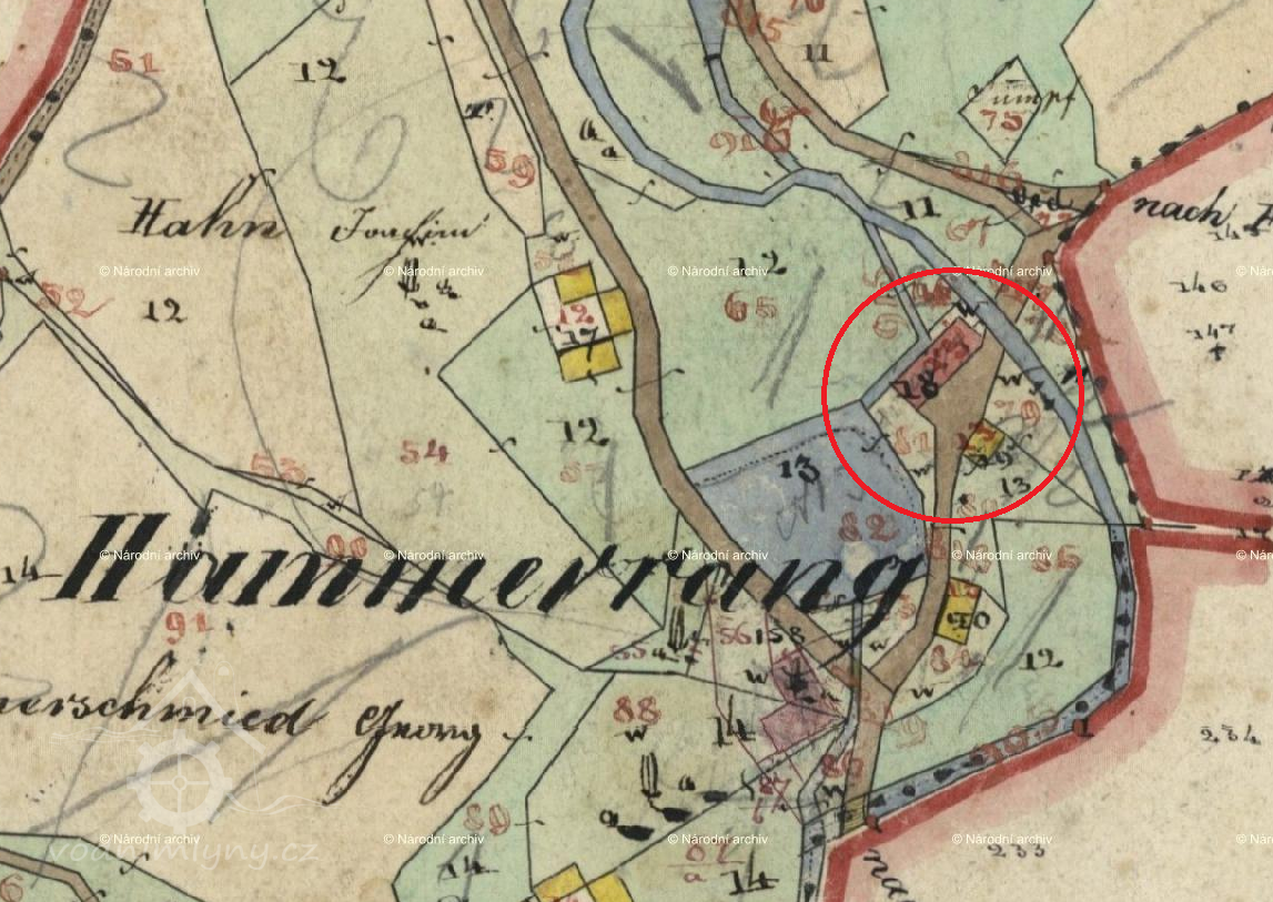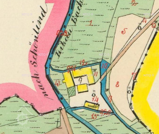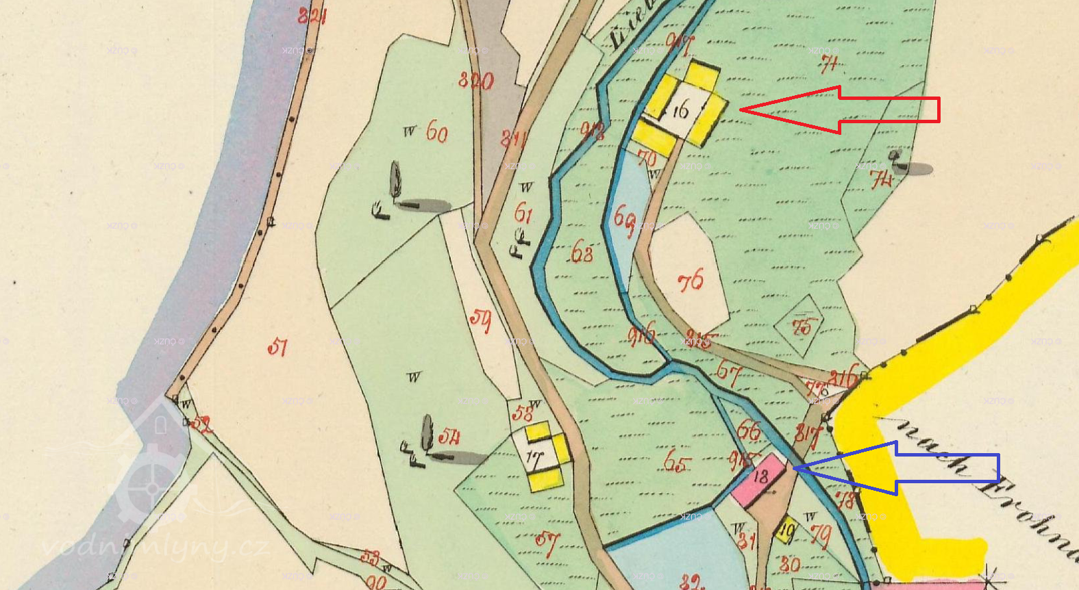 Gradlův (červeně) a Starkův (modře) mlýn, císařský povinný otoisk, výřez, 1841, © archivnimapy.cuzk.cz