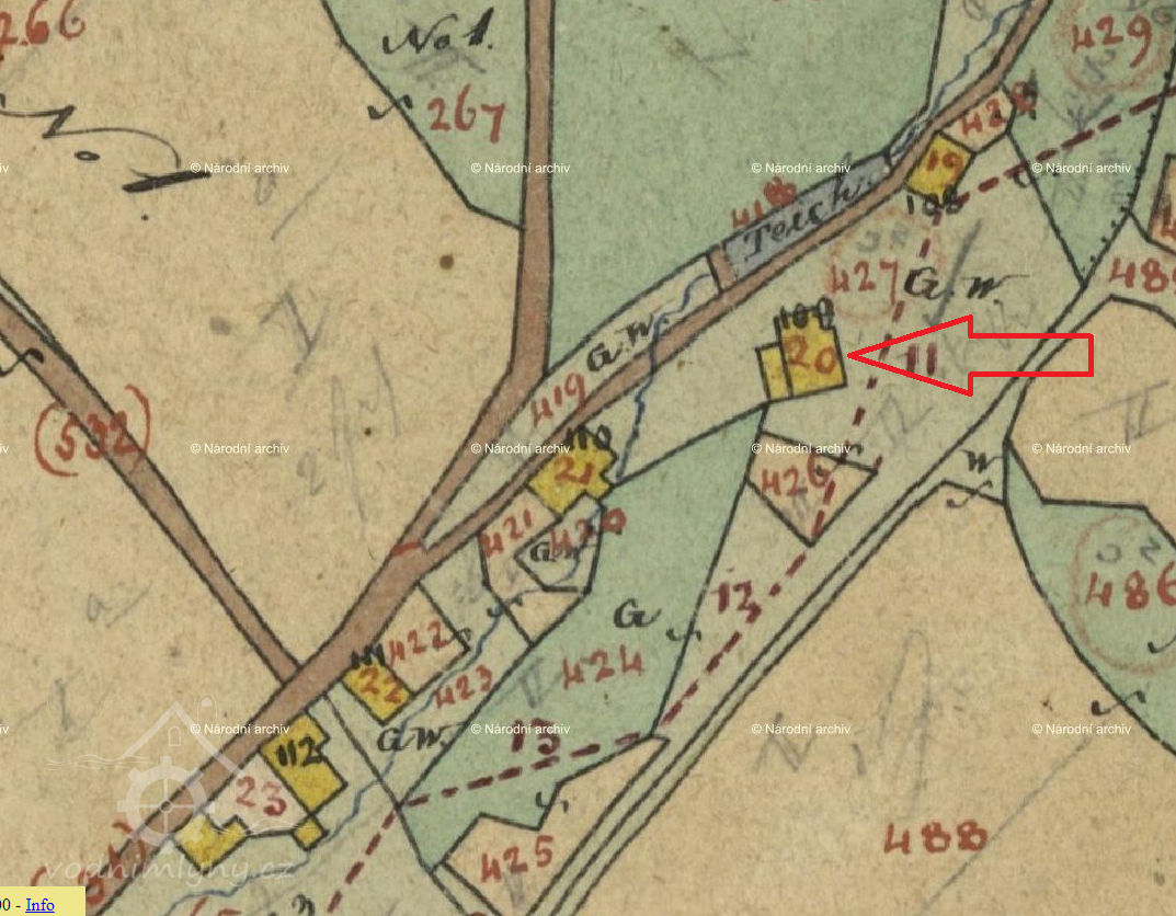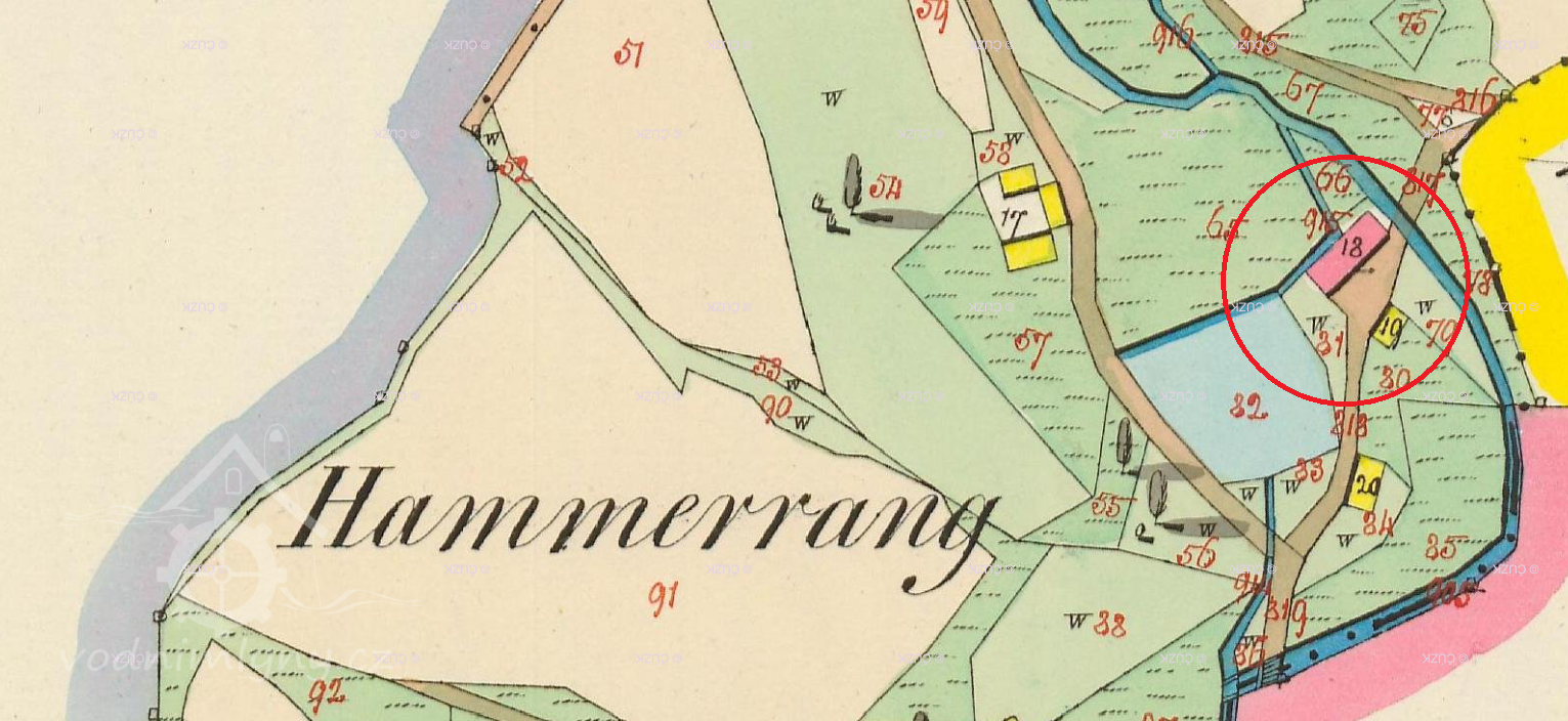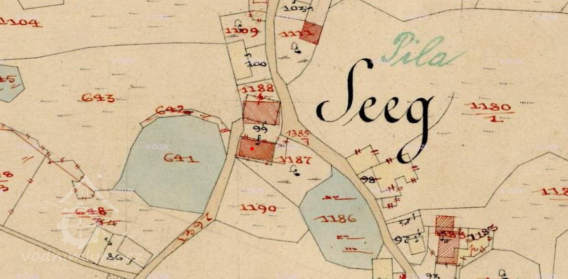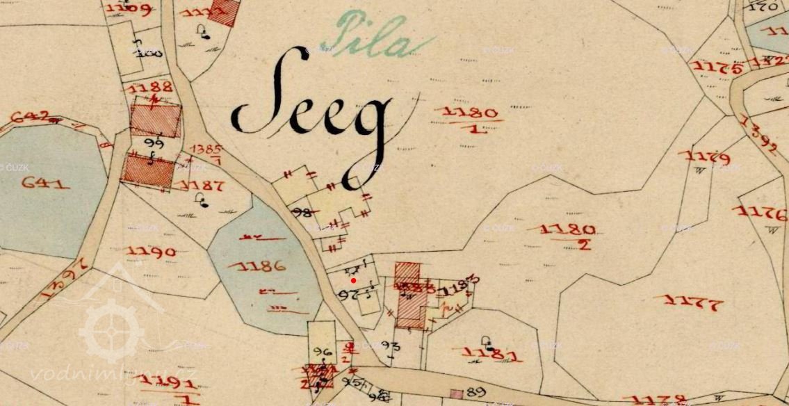 Gradlův (červeně) a Starkův (modře) mlýn, císařský povinný otoisk, výřez, 1841, © archivnimapy.cuzk.cz