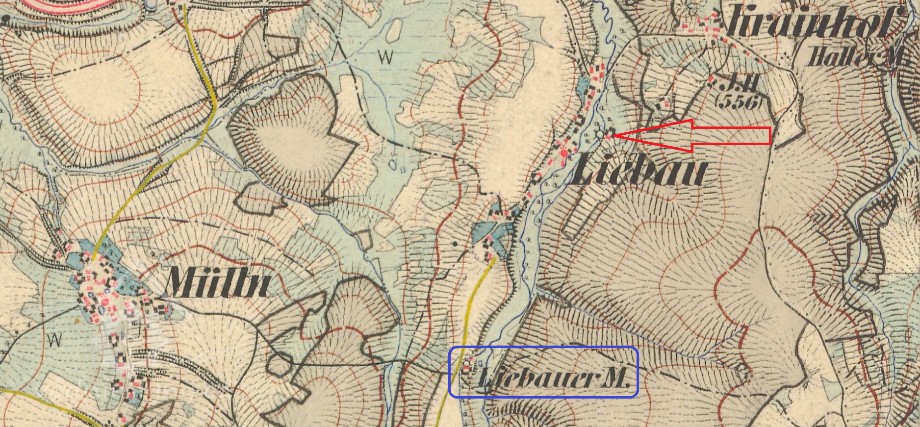 Mlýn v Libavě (červeně) a Libavský mlýn (modře), III. vojenské mapování, výřez, 1841, © oldmaps.geolab.cz