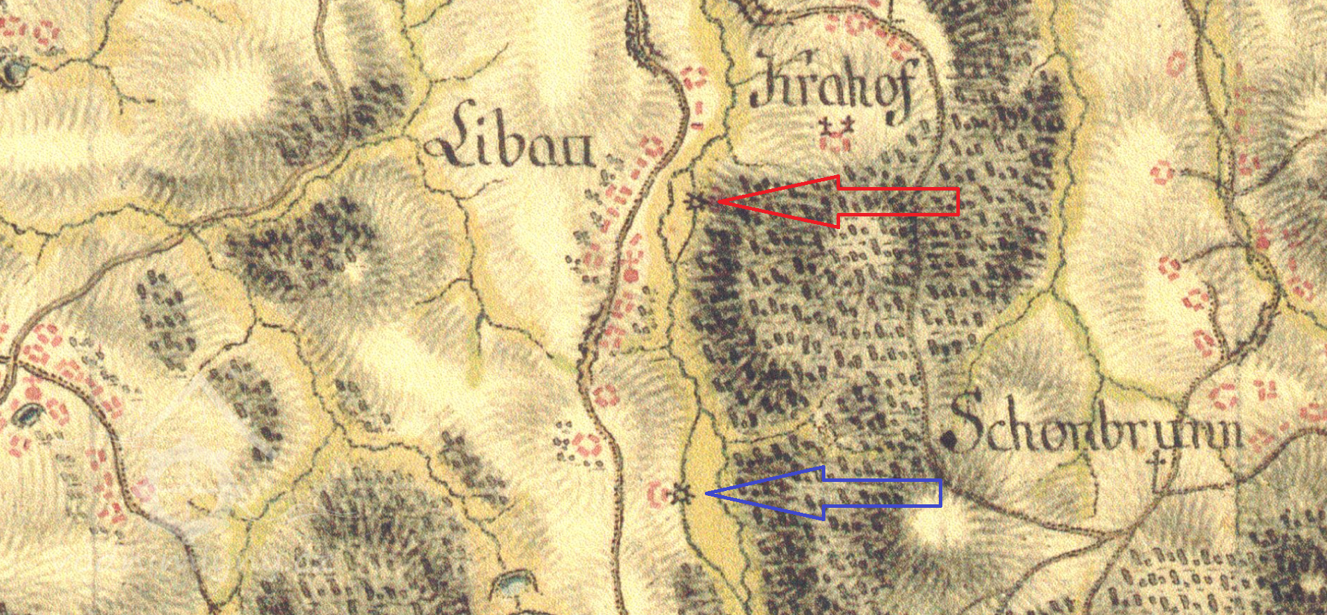 Mlýn v Libavě (červeně) a Libavský mlýn (modře), I. vojenské mapování, výřez, 1764-1768, © oldmaps.geolab.cz