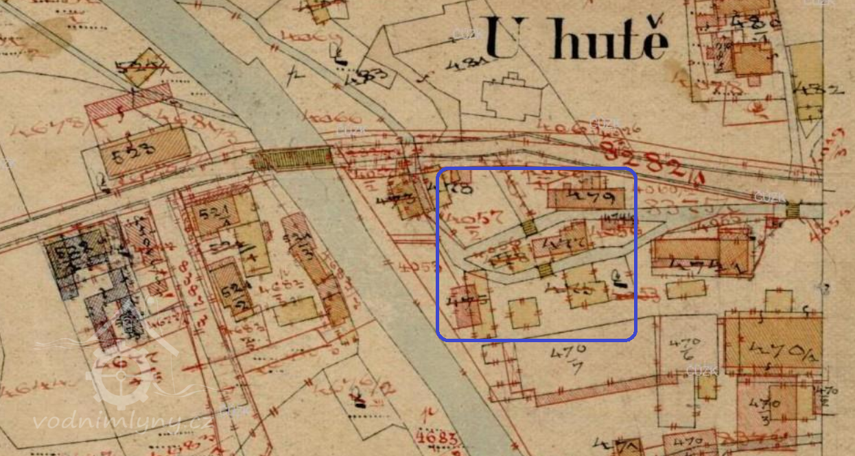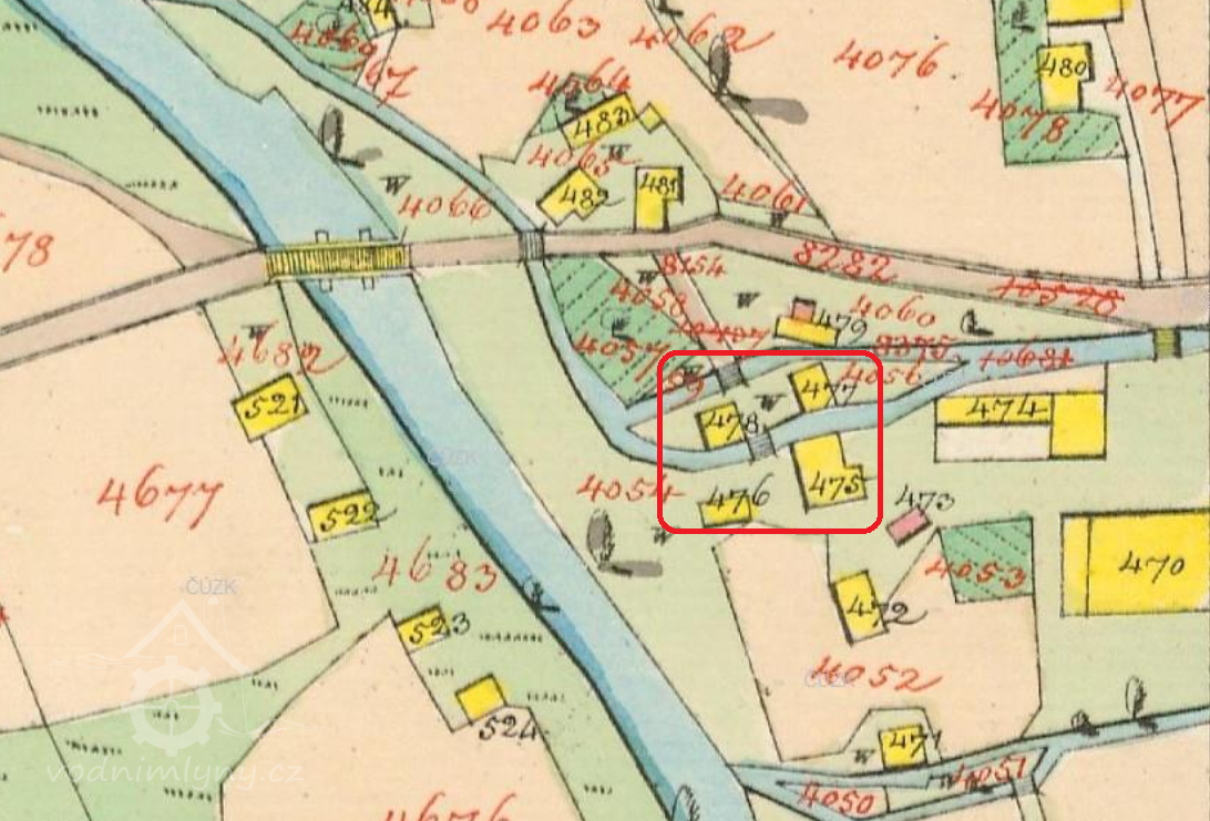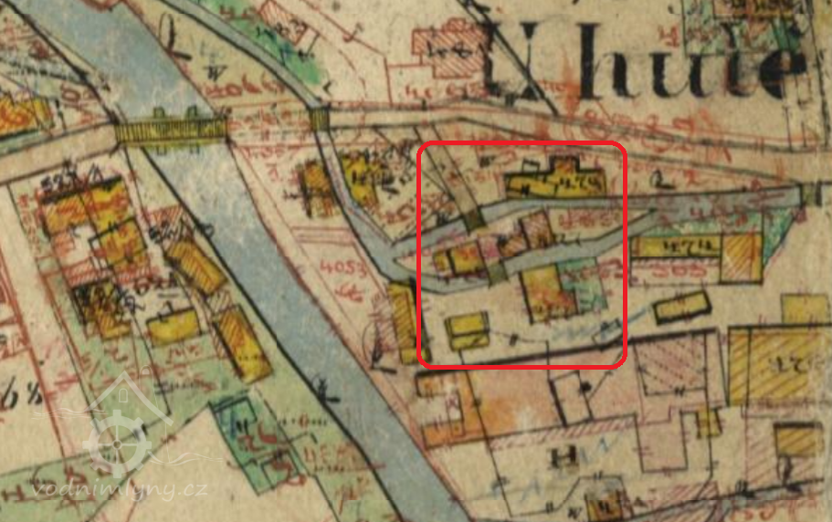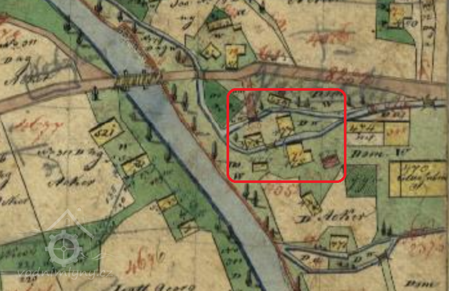 Na konci 19. století náhon vedl podél cesty a následně se rozdvojoval před Panským domem. Spodní náhon poháněl brusírnu sklárny a horní vedl k mlýnu, pile a "stupárně", kde se mlel křemen pro sklárny. Před mostem stála ještě velká pila patřící sklárnám (později vyhořela).