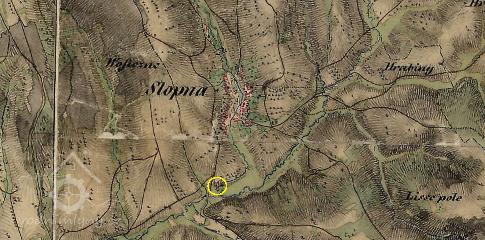 Velký spád potoka umožnil vybudování celé kaskády mlýnů, které nefungovaly současně a byly postaveny na 6 místech. První se nacházel pod skálou Čertovica, ta však již neexistuje. Ještě dnes ale můžeme v těchto místech vystopovat přívod vody a zástavu. V knize Luhačovické Zálesí se uvádí, že v roce 1663 byl ve Slopném při turecko-tatarském vpádu vypálen mlýn. Při kopání základů domku č. 28 se toto potvrdilo. Mlýn pod vesnicí disponoval největším zdrojem vody po zapojení přívodu ze splavu Pod břehy. U mlýna vznikla později i pila. Předchůdce dnešního funkčního mlýna, malý vodní mlýn, byl ještě kolem roku 1913 ve společném vlastnictví majitelů domů č. 8 (Kozubík)a č. 87 (Machů).