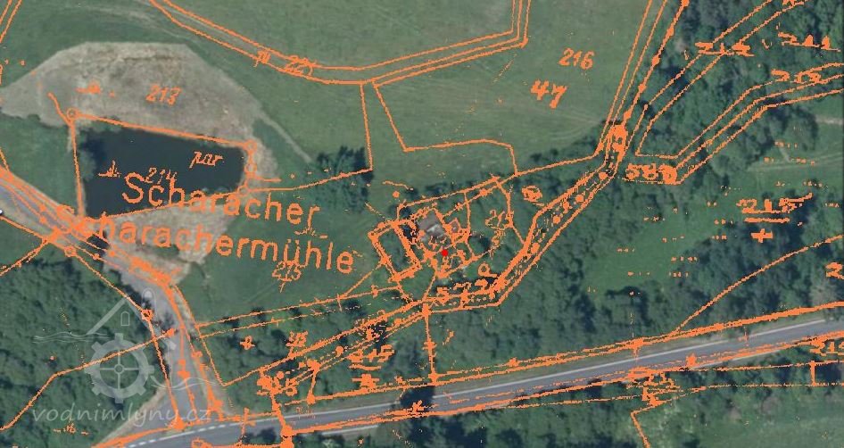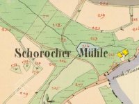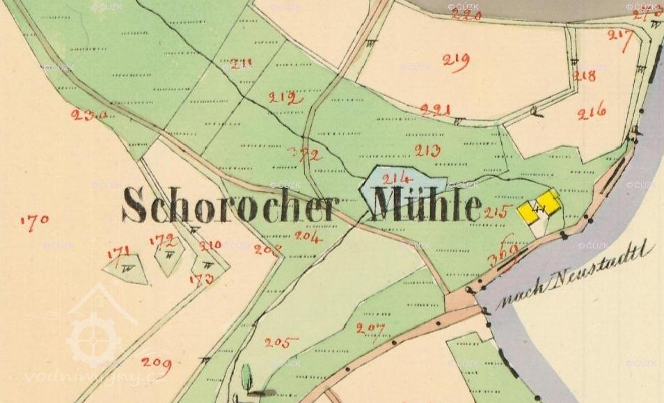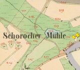 Také Schorochen Mühle (skica stab.kat.1837),Schoroscher Mühle (Speciální voj.mapa 1878),Schorachermühle (kniha"Im Lande...") nebo Scherachsmühle (publikace Zerstörte Böhmerwaldorte).