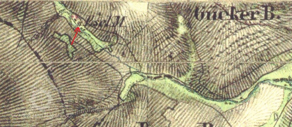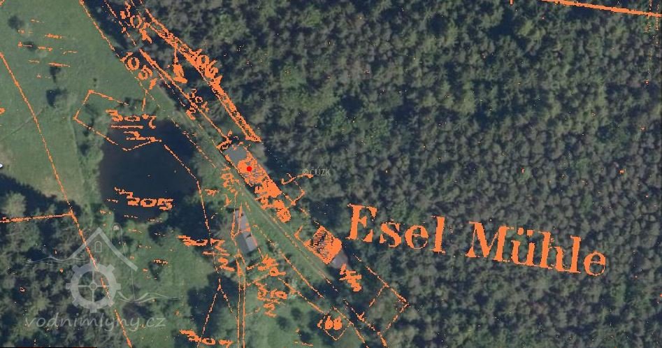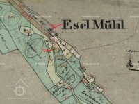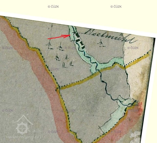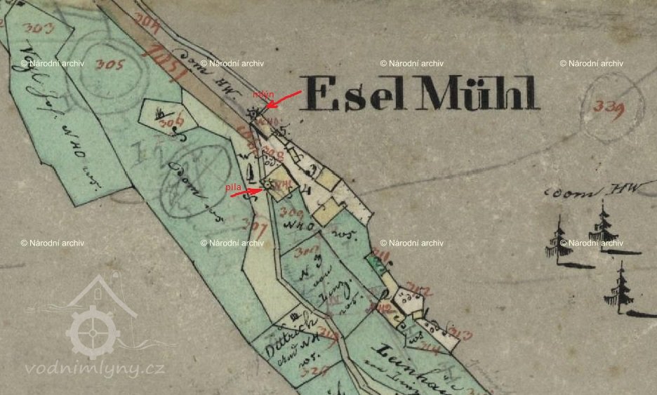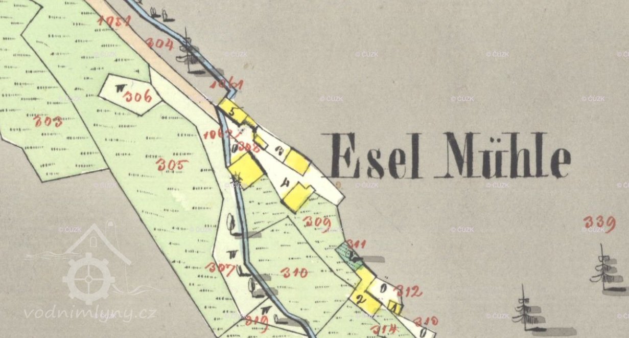 Na I. vojenském mapování – josefském 1764-1768 a 1780-1783 je zobrazeno vodní kolo bez názvu. Na II. vojenském mapování – Františkově 1836-1852 zakreslen jako Eisel Mühle. Mapa kultur stabilního katastru 1836-1844 jako Eiselmühl. 1838 - otisk a skica stabilního katastru – několik rozesetých budov pod souhrnným názvem Esel Mühle, mlýn je spalná budova s jedním kolem na potoce, kousek pod ní je č.41, což je pila, zobrazena také jako spalná budova s jedním kolem, vlastníkem mlýna Johann Vogel.