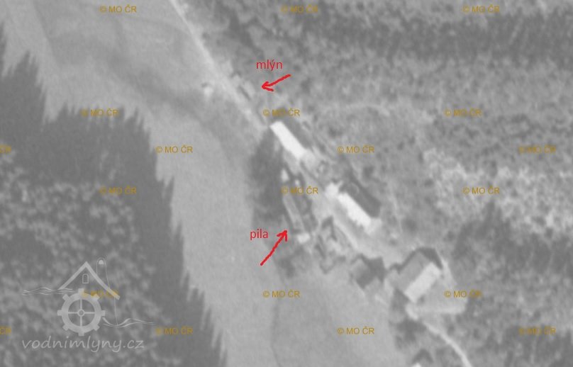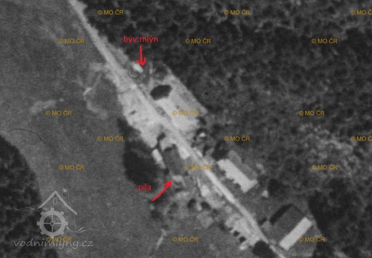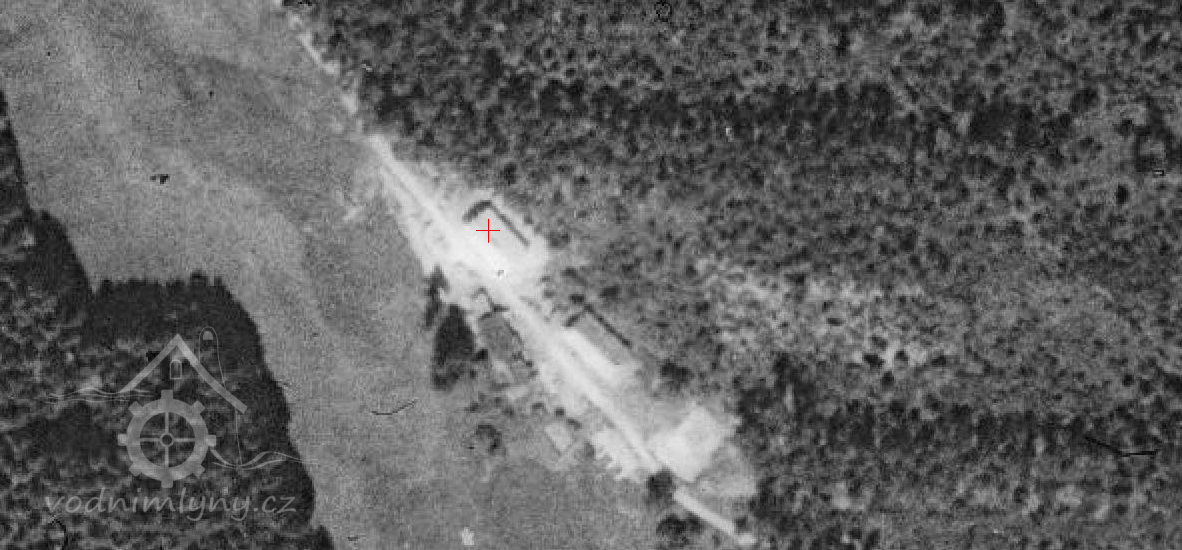 1947 – na leteckém snímku jsou vidět zbytky budovy mlýna, pila stojí.