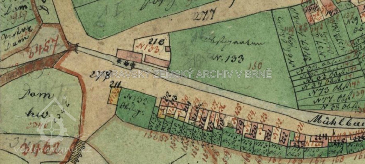 Po číslování domů v Hrušovanech roku 1771 měl mlýn čp. 38. Po přečíslování v roce 1805 získal mlýn čp. 133, což odpovídalo celkovému počtu čp. toho roku.(Jaroslav Stejskal)